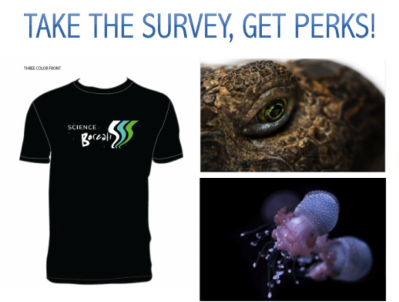 If you complete this survey fully, you will instantly receive a free high-resolution digital download of a science art photograph . You will also be entered into a draw for various prizes including a Science Borealis t-shirt (5 available), a PLOS t-shirt (10 available), and a $50.00 Amazon.com gift card (100 available)!